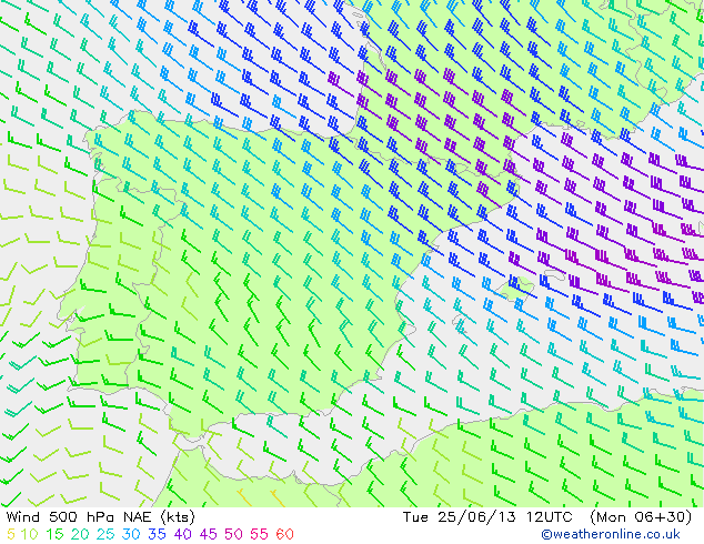 Al nivel de los 500 hectopascales,persiste una vaguada de onda larga sobre Europa central.Ya hacia el oeste se observa como el núcleo de la dorsal se centra sobre el extremo suroeste de la Península Ibérica.De nuevo queda la mitad norte peninsular bajo el lado descendente de una dorsal con advección del noroeste a 500 hectopascales.La situación sinóptica a este nivel es la que muestra el siguiente mapa: